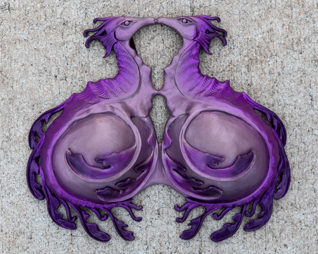 The Leafy Sea Dragon silicone top is a fantastic Finfolk top design featuring two beautifully hand-painted sea dragons facing each other. These tops are 100% silicone and use criss-crossing lycra straps that tie around stainless steel O-rings in the back to disperse pressure points and strain evenly, instead of only across your neck like typical halter styles, meaning no more bulkiness or heavy sogginess.