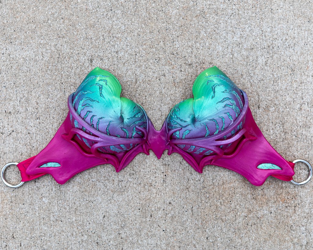 The Lothlorien silicone top is a beautiful Finfolk top design featuring Nautilus Shells. These tops are 100% silicone and use criss-crossing lycra straps that tie around stainless steel O-rings in the back to disperse pressure points and strain evenly, instead of only across your neck like typical halter styles, meaning no more bulkiness or heavy sogginess.