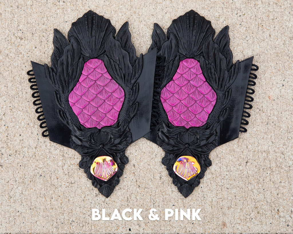Our gorgeous Gemini Arm Bracers are made from the same platinum cure silicone and paints as our full silicone tops and mermaid tails. They are skin safe, water safe, and will last for years to come! Each bracer features a matching iridescent mythic scale and matching glass crystals.