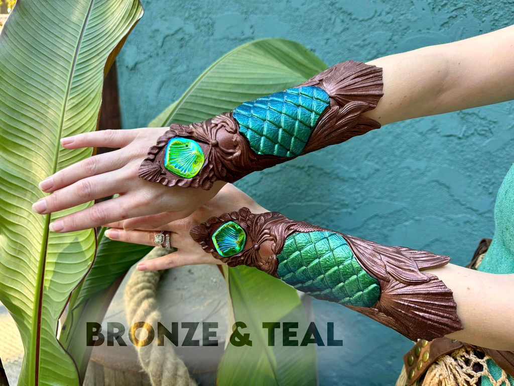 Our gorgeous Gemini Arm Bracers are made from the same platinum cure silicone and paints as our full silicone tops and mermaid tails. They are skin safe, water safe, and will last for years to come! Each bracer features a matching iridescent mythic scale and matching glass crystals.