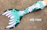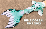 Finfolk fabric tails are designed to be the most beautiful, realistic fabric mermaid tails available today! Our swimmable fabric tails are created from 1mm, 4 way stretch scuba knit with sublimation printed designs that are realistically detailed and vibrant. Featuring highly desired, full sized Finfolk flukes, all fabric tails come with a durable vinyl monofin casing inside of the tail. Monofins are easily installed, and rest inside the casing secured by velcro, providing graceful flow and movement in the water. These tails will fit a variety of monofins up to the dimensions listed below. We recommend monofins with short, stiff blades such as the FINIS Shooter monofin or Adult Mermaid Linden by Bodyglove monofin