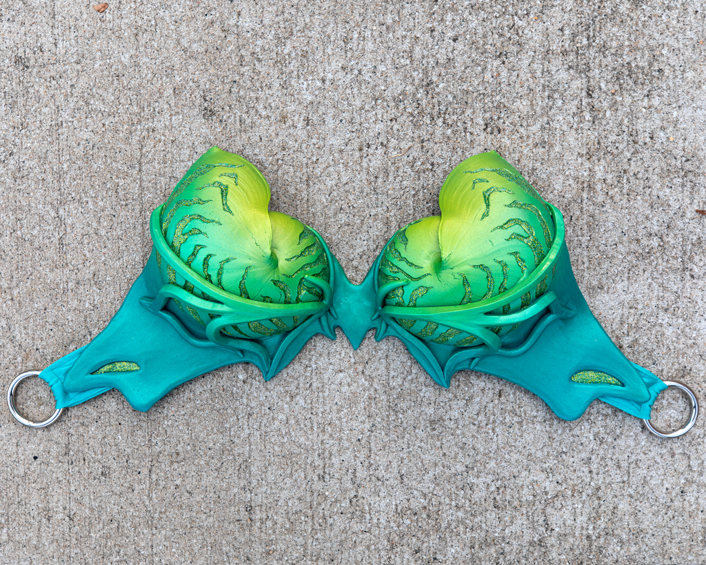 The Lothlorien silicone top is a beautiful Finfolk top design featuring Nautilus Shells. These tops are 100% silicone and use criss-crossing lycra straps that tie around stainless steel O-rings in the back to disperse pressure points and strain evenly, instead of only across your neck like typical halter styles, meaning no more bulkiness or heavy sogginess.