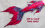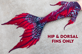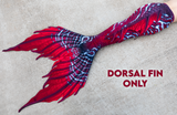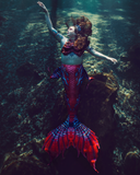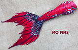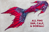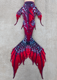 This deep red and crimson masterpiece, adorned with bewitching black and silver stripes, is aptly named Zaleska, after Dracula's infamous daughter. Zaleska was said to carry mysterious gemstones as she journeyed to escape her vampiric form. With every graceful swish, this tail is truly captivating in the water, standing out with its deep reds and truly metallic-like sheen. This tail features Merbella’s She-Creature fluke.