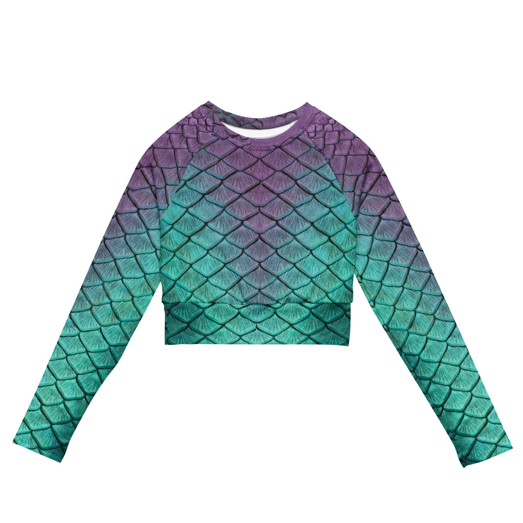 Rep your scales wherever you go with this cropped rash guard! It protects from the sun, wind, and other elements whether on land or in sea!