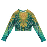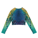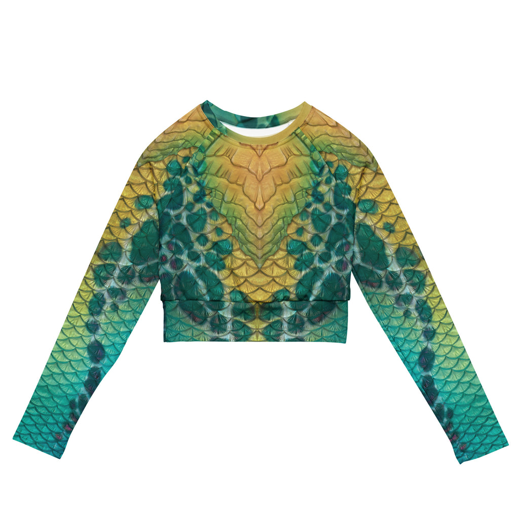 Rep your scales wherever you go with this cropped rash guard! It protects from the sun, wind, and other elements whether on land or in sea!