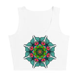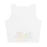 This crop tank features the Finfolk Mandala design on the front and Finfolk rainbow logo on the back.