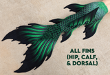 Finfolk fabric tails are designed to be the most beautiful, realistic fabric mermaid tails available today! Our swimmable fabric tails are created from 1mm, 4 way stretch scuba knit with sublimation printed designs that are realistically detailed and vibrant. Featuring highly desired, full sized Finfolk flukes, all fabric tails come with a durable vinyl monofin casing inside of the tail. Monofins are easily installed, and rest inside the casing secured by velcro, providing graceful flow and movement in the water. These tails will fit a variety of monofins up to the dimensions listed below. We recommend monofins with short, stiff blades such as the FINIS Shooter monofin or Adult Mermaid Linden by Bodyglove monofin