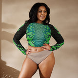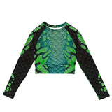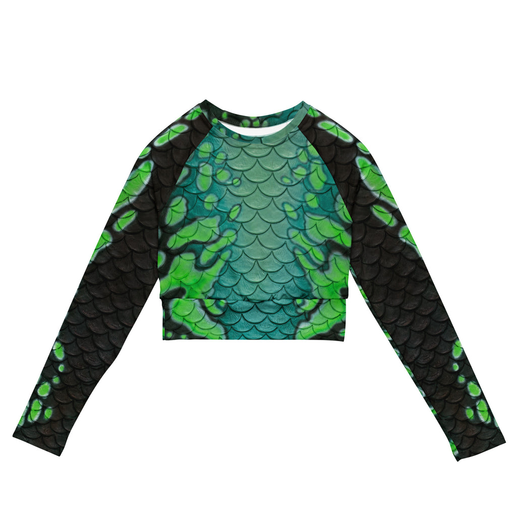 Rep your scales wherever you go with this cropped rash guard! It protects from the sun, wind, and other elements whether on land or in sea!