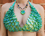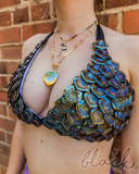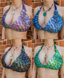 This bikini style top ties at the neck and back for an all over easy fit! Super soft and durable swimwear lycra fabric, fully covered in iridescent Mythic scales!