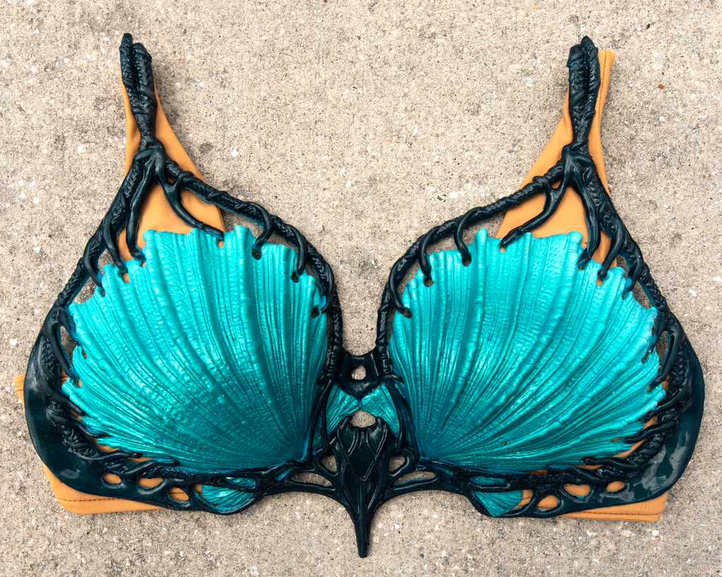 Inspired by the organic materials and weaving techniques of Pandora, the shell weaver silicone top features two styled clam shells suspended in a woven base with an elegant manta ray nestled in the underbust.